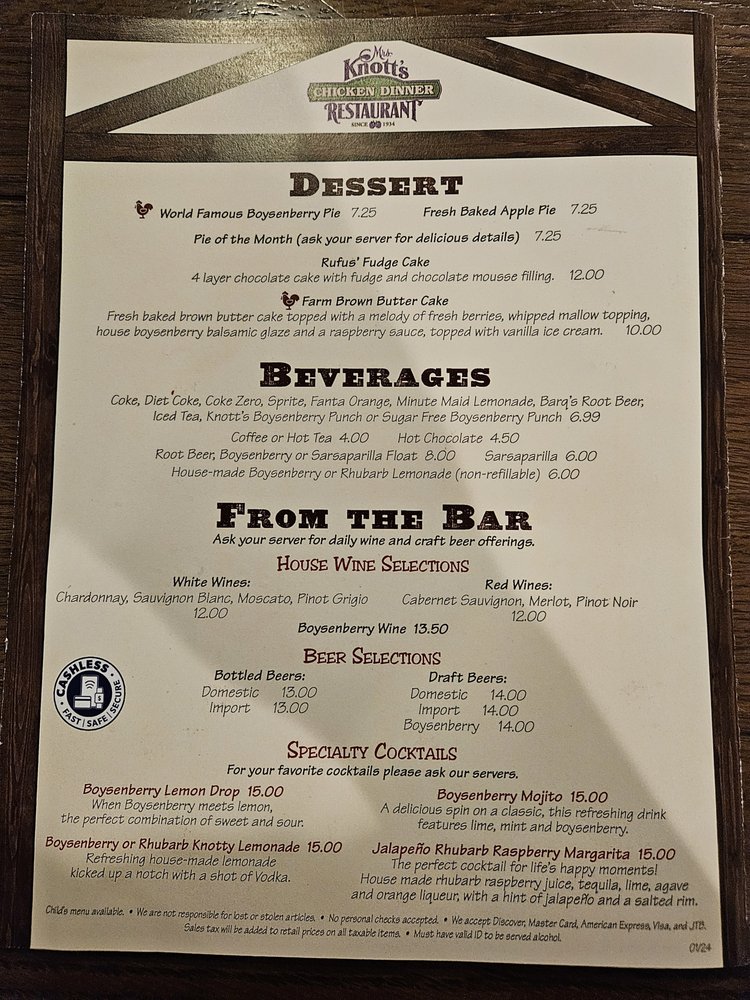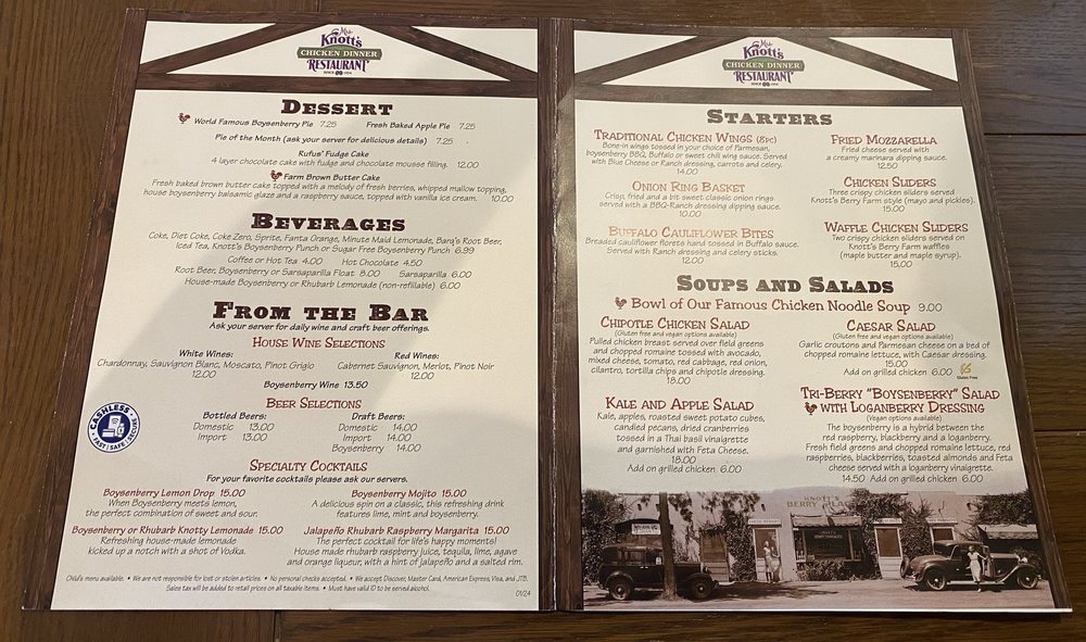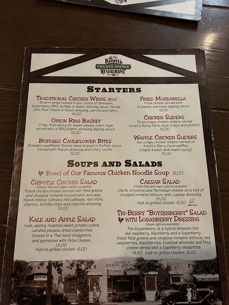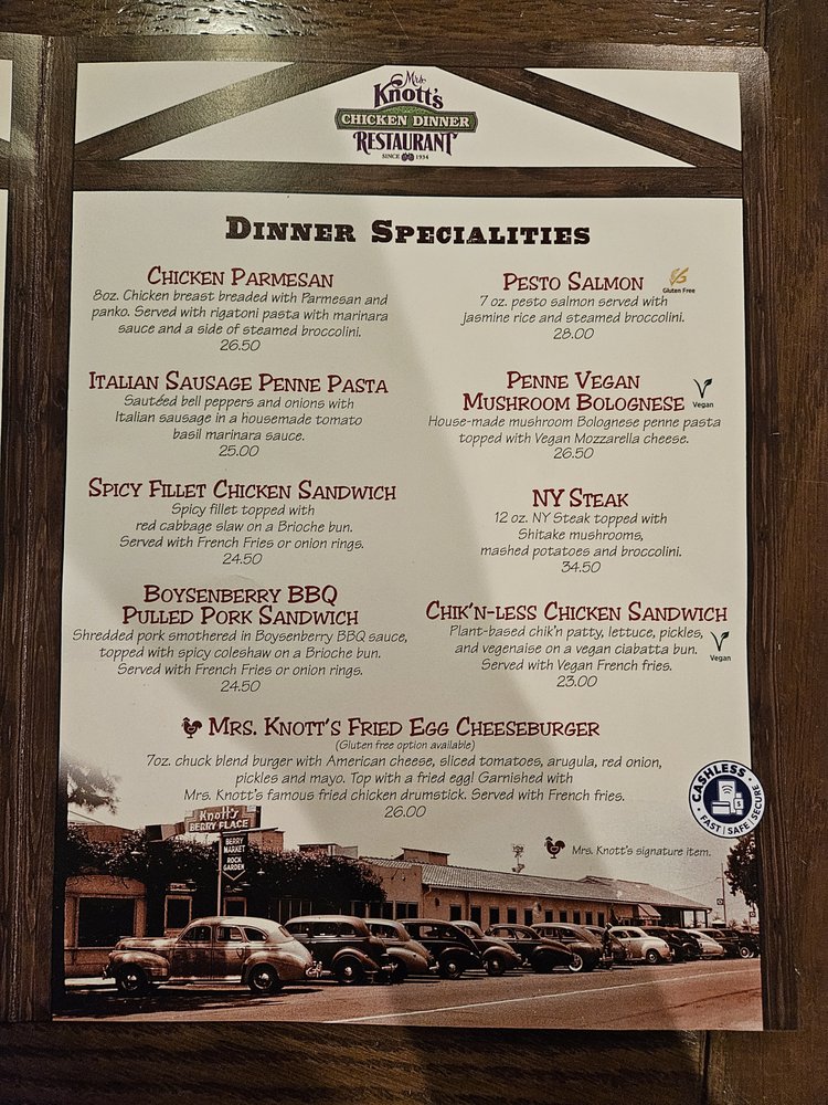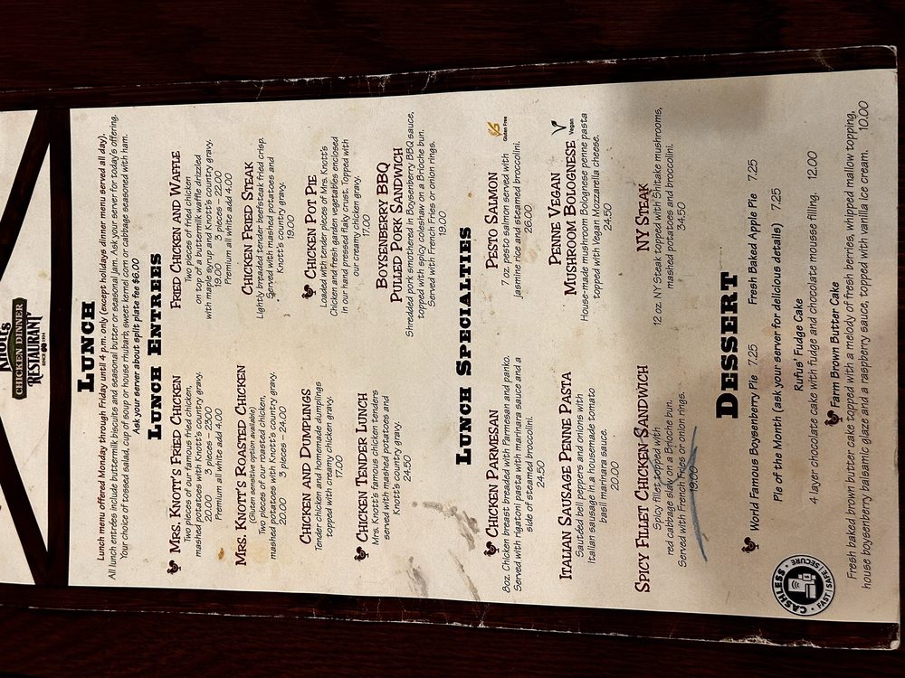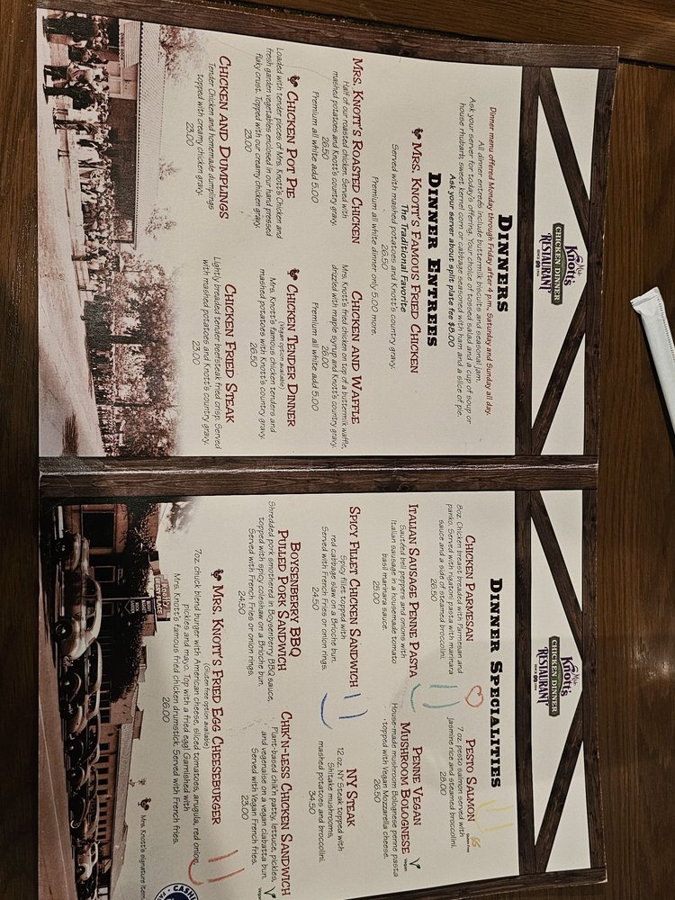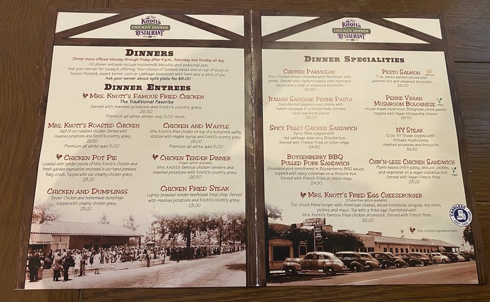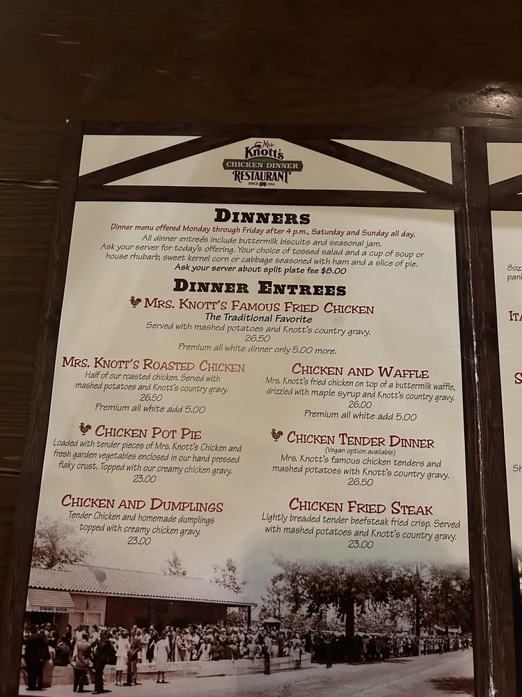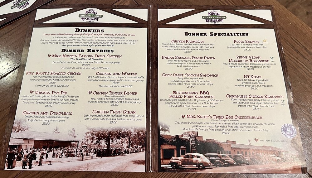 Mrs Knott’s Chicken Dinner, located in Buena Park, CA, offers a variety of dining options including vegan and limited vegetarian choices. With a casual and touristy atmosphere, this restaurant is wheelchair accessible and provides QR code menus. The menu features fried chicken, chicken soup, mashed potatoes, gravy, homemade biscuits, Boysenberry jam, warm brown butter cake, and more. Customers rave about the delicious food and attentive service, particularly highlighting the crispy chicken, macaroni and cheese, and flavorful gravy. The restaurant also offers a buffet option during the Knott's Scary Farm event. Overall, Mrs Knott’s Chicken Dinner provides a satisfying dining experience with ample food portions, a clean environment, and friendly staff.